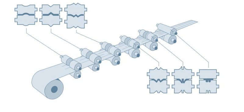 輥軋成型工藝將一塊連續(xù)的平金屬板送入一系列連續(xù)的硬化鋼輥中,這些鋼輥在金屬通過(guò)時(shí)一站一站地將金屬成型為成品形狀。