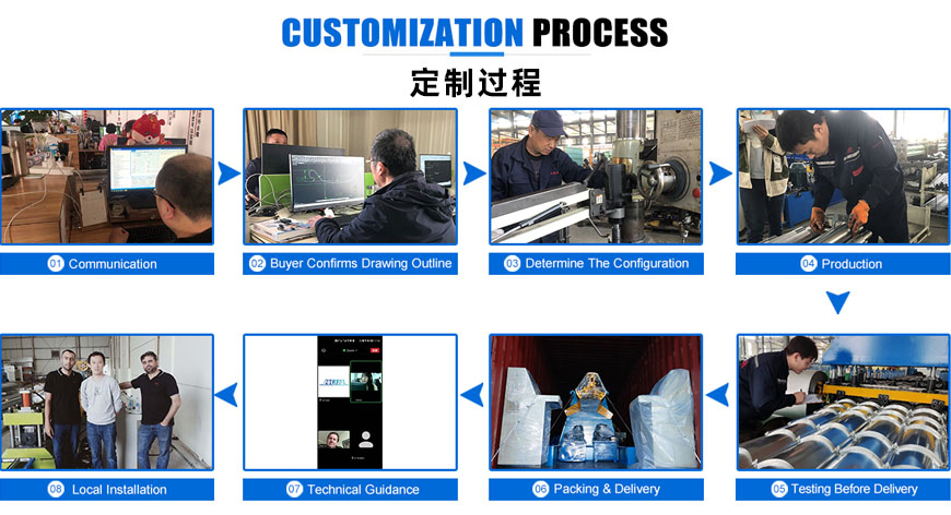 梯形彩鋼瓦生產(chǎn)設(shè)備采用分體式成型工藝,同時(shí)在入料端口采用覆膜裝置,這一設(shè)計(jì)組合在技術(shù)實(shí)現(xiàn)與實(shí)際應(yīng)用中具有明確的針對(duì)性和優(yōu)化價(jià)值。其中,分體式成型工藝是將傳統(tǒng)一體化的輥壓成型過程拆解為多個(gè)獨(dú)立運(yùn)作的模塊分步完成,具體來說,設(shè)備每個(gè)分步輥壓單元負(fù)責(zé)梯形截面成型過程中的特定環(huán)節(jié),比如預(yù)彎、折邊或定形等,通過這樣的分步操作,能夠靈活調(diào)整各模塊的輥壓角度、壓力等參數(shù),從而適配不同波高、波距、板厚規(guī)格的梯形彩鋼瓦生產(chǎn)需求,既減少了因產(chǎn)品規(guī)格切換而產(chǎn)生的整體設(shè)備調(diào)試時(shí)間,又能通過分散輥壓應(yīng)力避免板材在成型過程中出現(xiàn)褶皺、開裂等問題,同時(shí)單個(gè)模塊的獨(dú)立設(shè)計(jì)也便于后期的維護(hù)與更換,降低了設(shè)備整體的故障率,尤其適合小批量、多規(guī)格的定制化生產(chǎn)場景。